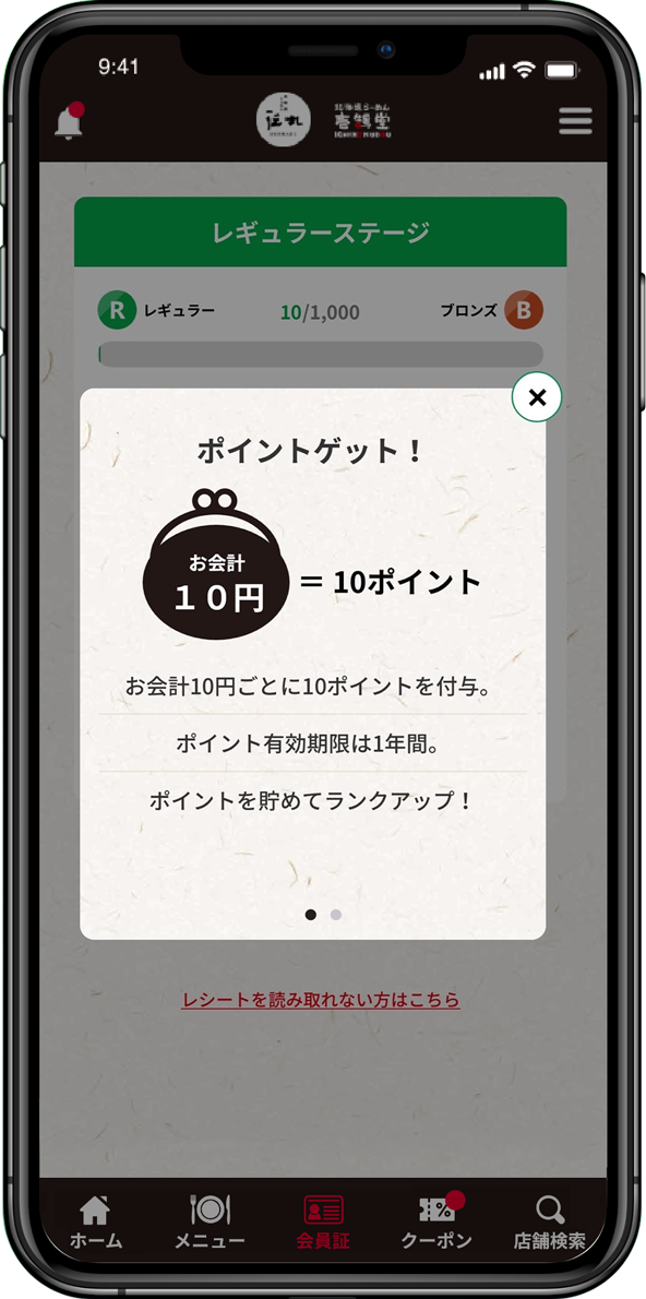 アプリの会員証画面からカメラを起動し、レシートに印字されたQRコードを読み込むとポイントが付与されます。